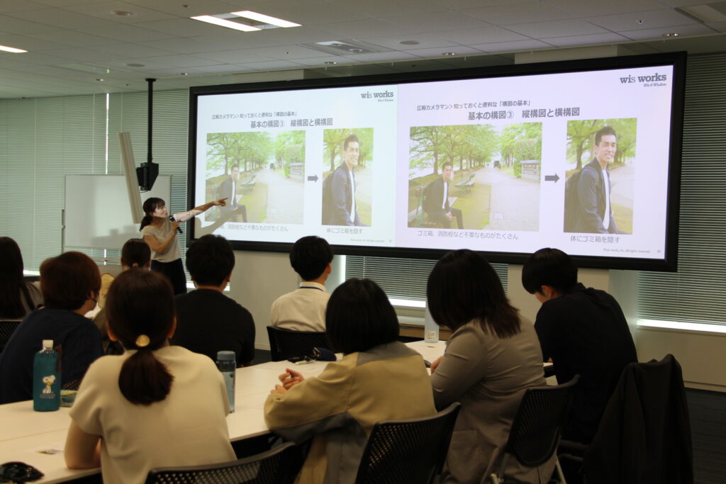 午後は実践編。チームごとに室内外で撮影ワークを実施。集合写真や個人写真などを選んで発表し合い、講師の講評を受けました。撮る・選ぶ・共有する一連の流れを体験することで、社内発信の現場で活かせる実践的な学びを持ち帰ることができました。