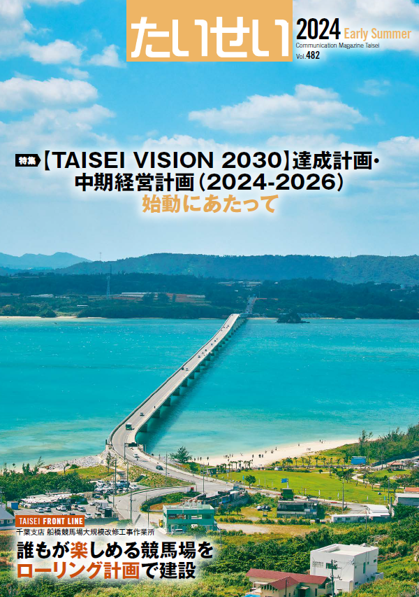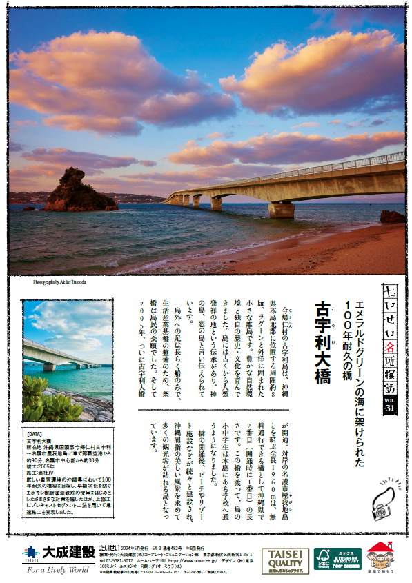 表紙と表4が連動する「たいせい名所探訪」は、新旧を問わず、当社が施工した物件の現在を撮り下ろすことで、「人がいきいきとする環境を創造する」という当社のグループ理念を社員に身近に感じてもらう企画です。この号では、沖縄北部の離島、古宇利島に架かった古宇利大橋をピックアップし、景観に溶け込んだ美しい姿を掲載しました。表4では建設の意義や施工の工夫を紹介し、社員やご家族が「実際に行ってみたい」「お父さん・お母さんの会社ってすごいね!」と思ってもらえることを目指しています。読者アンケートでも人気の企画です。