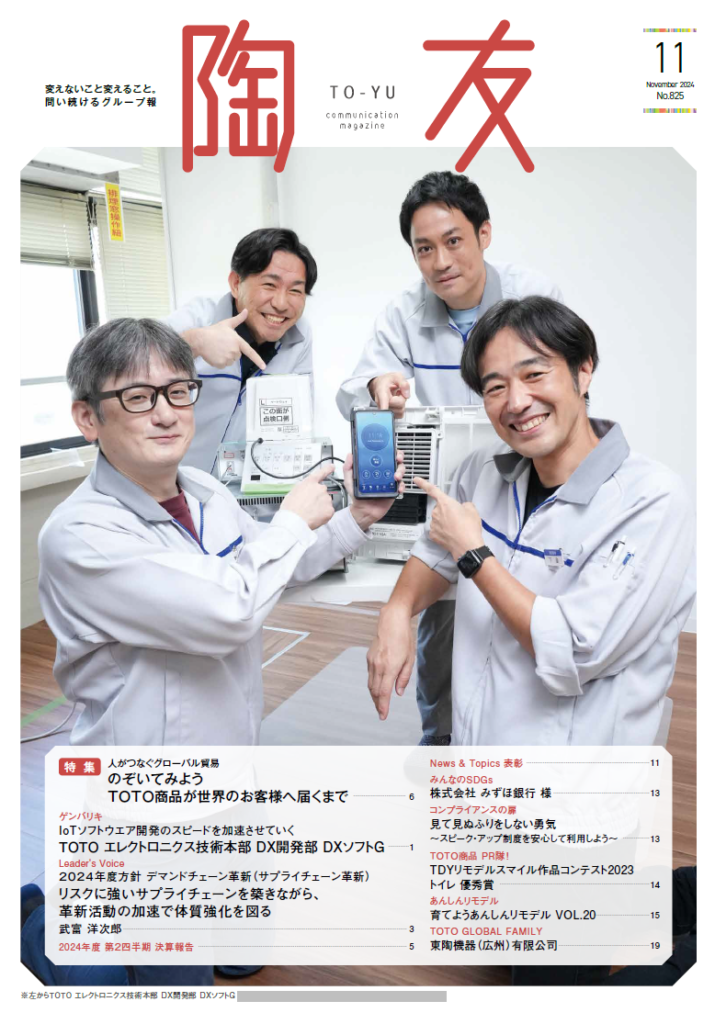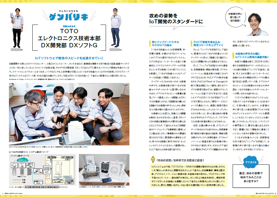 表紙は、最前線で活躍するグループ員を紹介する「ゲンバリキ」と連動しています。「ゲンバリキ」は単なる職場紹介ではなく、課題に対してどのように取り組んだのか、グループ員の頑張りを紹介するコーナー。他部門の仲間のことを知ることができると人気があります。部門やチームの雰囲気を伝えるため、先に取材を行い、取材対象者のキャラクターやチームのムードをつかんだ上で表紙の撮影を行うのがこだわり。ポーズや撮影場所などを変えて2パターンを撮影し、本人たちが気に入った写真を掲載することで、良い記念になると喜ばれています。
