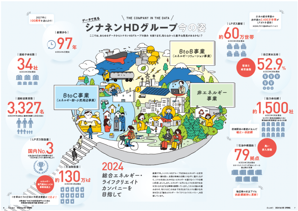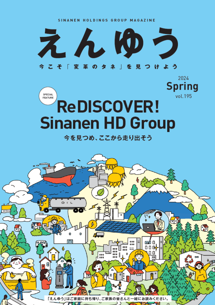 中面の特集と連動したイラストを用い、グループ全体が一丸となって社会を支えている様子を表現しました。