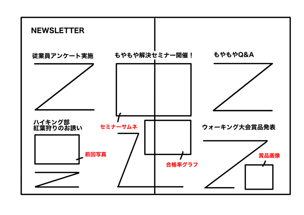ほかにも、画像の大きさで強弱をつけると、よりメリハリが効いて伝わりやすい紙面になるよ。全部大事だから全部大きくしたい! だと、読者が疲れちゃうからね。