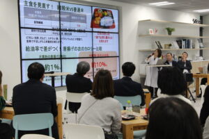 事業内容や理念についての共有がメインでしたが、リズミカルでユーモラスなトークと、時折「クスッ」と笑ってしまうジョークで会場は温かい雰囲気に。専門性の高いデータや現場の話題については、栄養士や責任者が登場。短い時間にもかかわらずスピーカーが切り替わる構成だったため、「何を伝えたいのか」「何を持ち帰ってほしいのか」が端的で、とても分かりやすく届けられていた印象です。